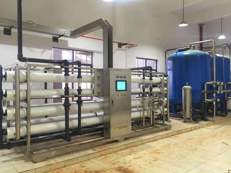 RO反滲透設備是采用膜分離手段來去除水中的離子,有機物,膠體微粒、細菌等雜質,使水達到脫鹽純化的目的。其原理是水與溶液以滲透膜相隔,水則向溶液滲透,兩相之間有滲透壓,若在溶液相上加壓,使壓力大于滲透壓,則溶液中的水就會向水相反滲透去,利用反滲透而取得脫鹽水。即原水在足夠的壓力下,通過滲透膜而變成純水,沒有通過膜的水,其溶解物、懸浮物的濃度逐漸增大,作為濃水排出。